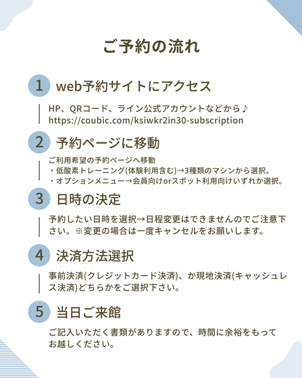 ※低酸素トレーニングを体験したい方もweb予約サイトよりご予約下さい。(会員様の予約ページと同じになります。詳しくはweb予約サイトをご確認下さい。)